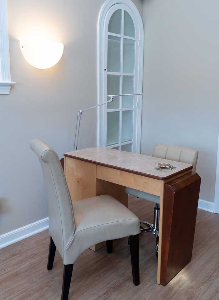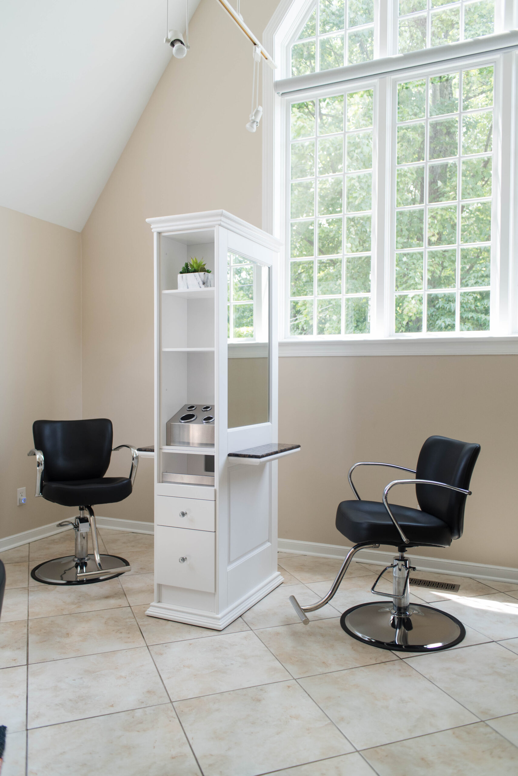 - One styling station with lockable storage, styling chair, mat, mirror.